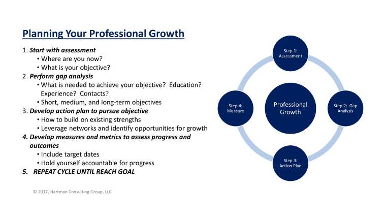 Thinking about where you may be professionally in five years can be both a fun yet scary experience. It is fun to think of how much can be learned in five years and the opportunities that may be available. It is also scary to think you may not be ready for the opportunities when they do come. So what is a practical approach to help ensure you have the appropriate knowledge, skills, and experience when opportunity knocks on our door? Planning for professional growth should be purposeful and strategic. Presented below is a four-step process that, when used consistently, will help you get to your goals.